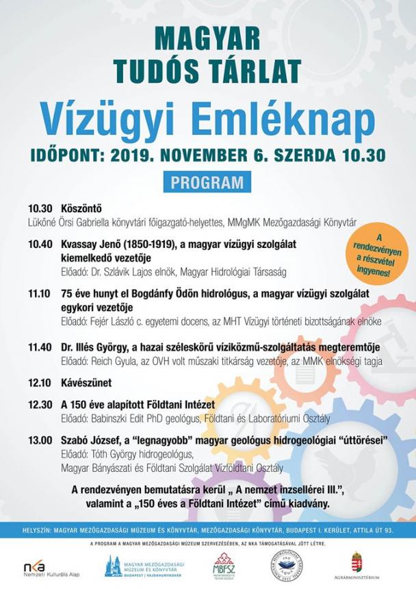 A Magyar Mezőgazdasági Könyvtár idén is, 2019. november 6-án 10.30 órakor kezdődően megtartja hagyományos vízügyi emléknapját. A rendezvényen a vízügy területén tevékenykedő, értékteremtő szakemberekről emlékeznek meg. A belépés ingyenes, minden érdeklődőt szeretettel várnak, Helyszín: MMgMK Mezőgazdasági Könyvtár, 1012 Budapest Attila út 93. A programhoz kapcsolódó kamarakiállításon a Magyar Mezőgazdasági Múzeum és Könyvtár anyagából láthatnak válogatást a résztvevők. |