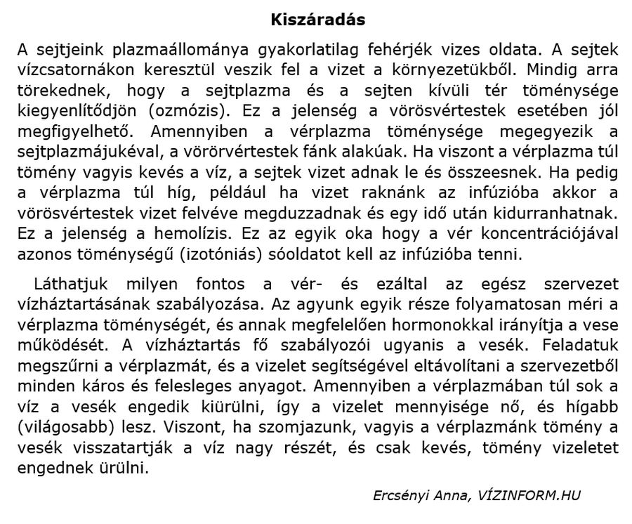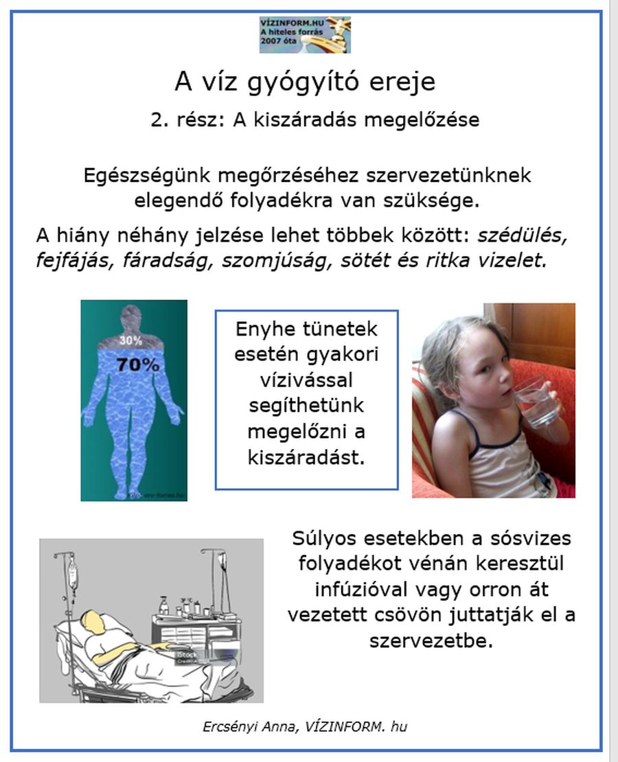 Igyunk több vizet a megszokottnál a nyári melegben! Testünk normális működéséhez napi 2-3 liter víz feltétlenül szükséges. Ilyenkor, a magasabb nátriumtartalmú víz ajánlatos, hogy pótolni tudjuk az izzadáskor elveszett sómennyiséget. Ugyanakkor a túl nagy vízfogyasztást is kerülni kell! Orvosi értelemben vízmérgezés következhet be, ha valaki rövid idő alatt nagyobb mennyiséget, 4-10 liter vizet iszik. Az emberi szervezet, a vesék ezt már nem biztos, hogy képesek feldolgozni. A hőségriadók idején több embertársunkat szállították kórházba a mentők a túl nagy vízfogyasztás okozta vízmérgezés miatt. Ercsényi Anna