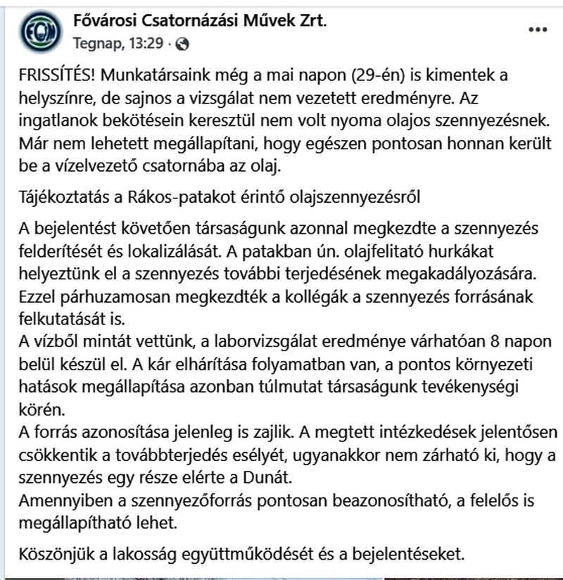 Olajszennyezés tart a Duna felé a Rákos-patakon